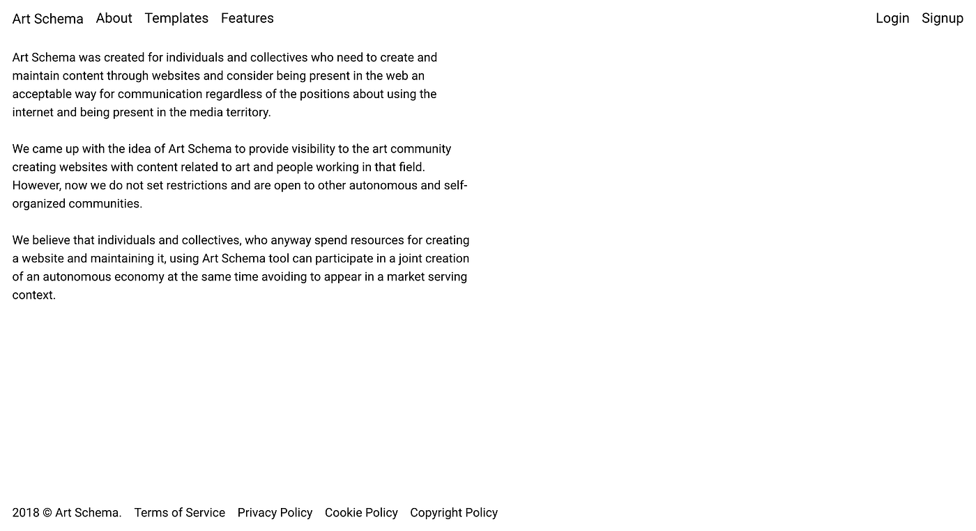 You won´t find much info on their site. It is a free service and made for artists. Here you´ll see the sense of community. Nice templates and examples where you can filter with different categories (all, architecture, sculpture & craft, fashion, graphic design, illustration, jewelry, photography, traditional painting and other).