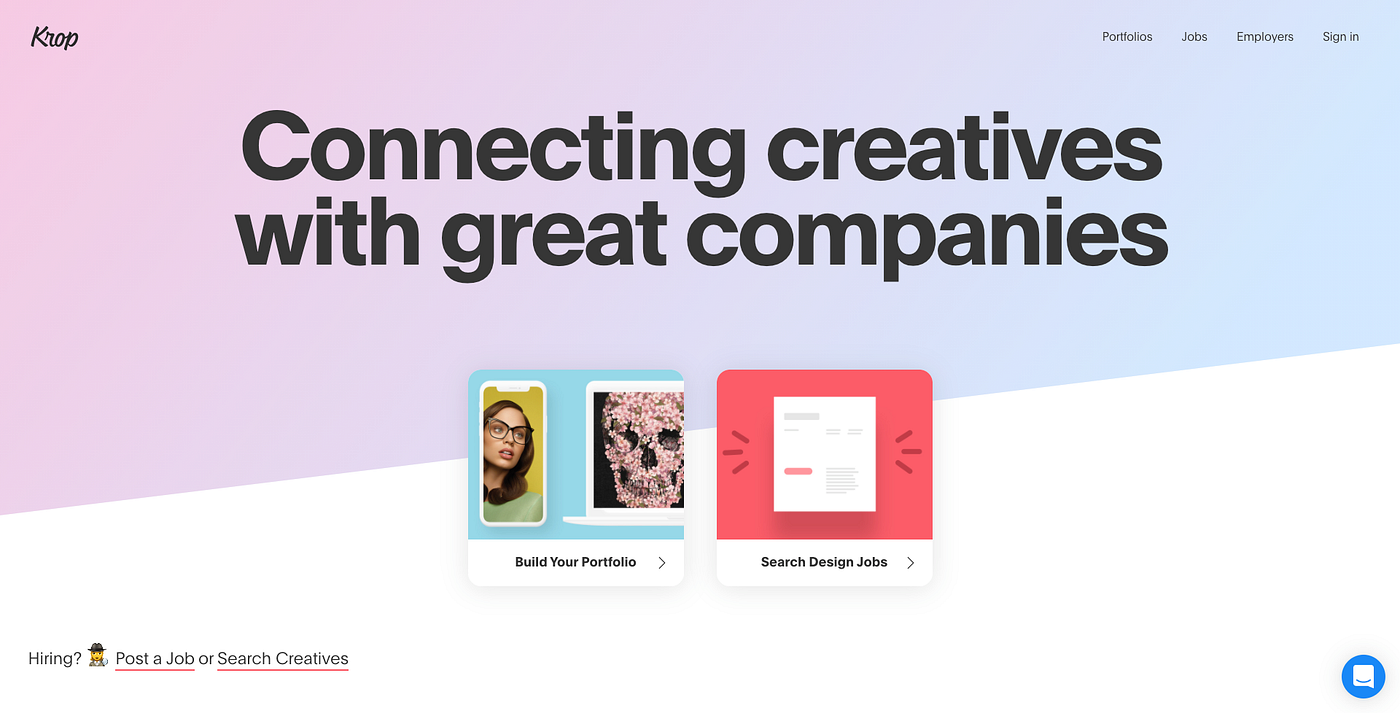 Here is one of the interesting points about portfolio builders, they are increasingly related to the job market, and Krop is a good example. As they head "Ready to hire: Search portfolios and resumes of world class creatives at all levels".